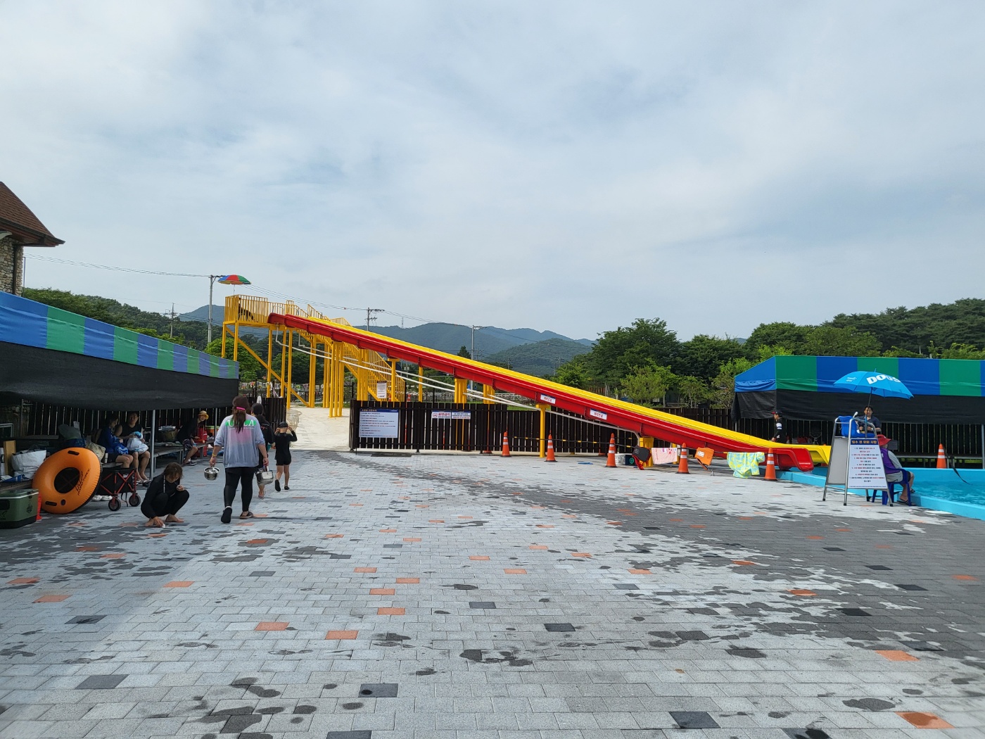 어린이수영장에 작은 놀이터에서나 볼법한 미끄럼틀이 있는데 12세 미만 아이들에게는 충분히 즐거울만한 크기였다. 물로 풍덩 빠지는 기분도 괜찮아보이고 미끄럼틀에 물도 흘러나와서 잘 미끄러진다. 그리고 10분마다 수영장 정비를 해주기 때문에 야외수영장 특유의 나뭇잎이나 벌레들이 떠 있는 경우도 많이 없었다. 아이들이 놀다가 흐름이 끊겨서 조금 아쉬워하기도 하고 점심시간의 경우 1시간이나 쉬기 때문에 좀 아쉬워하는 부분이 있긴 했다.