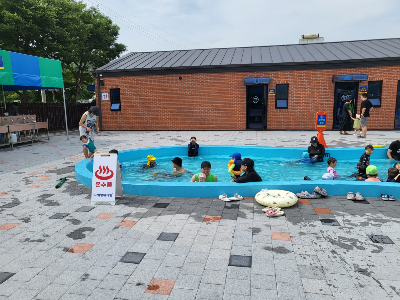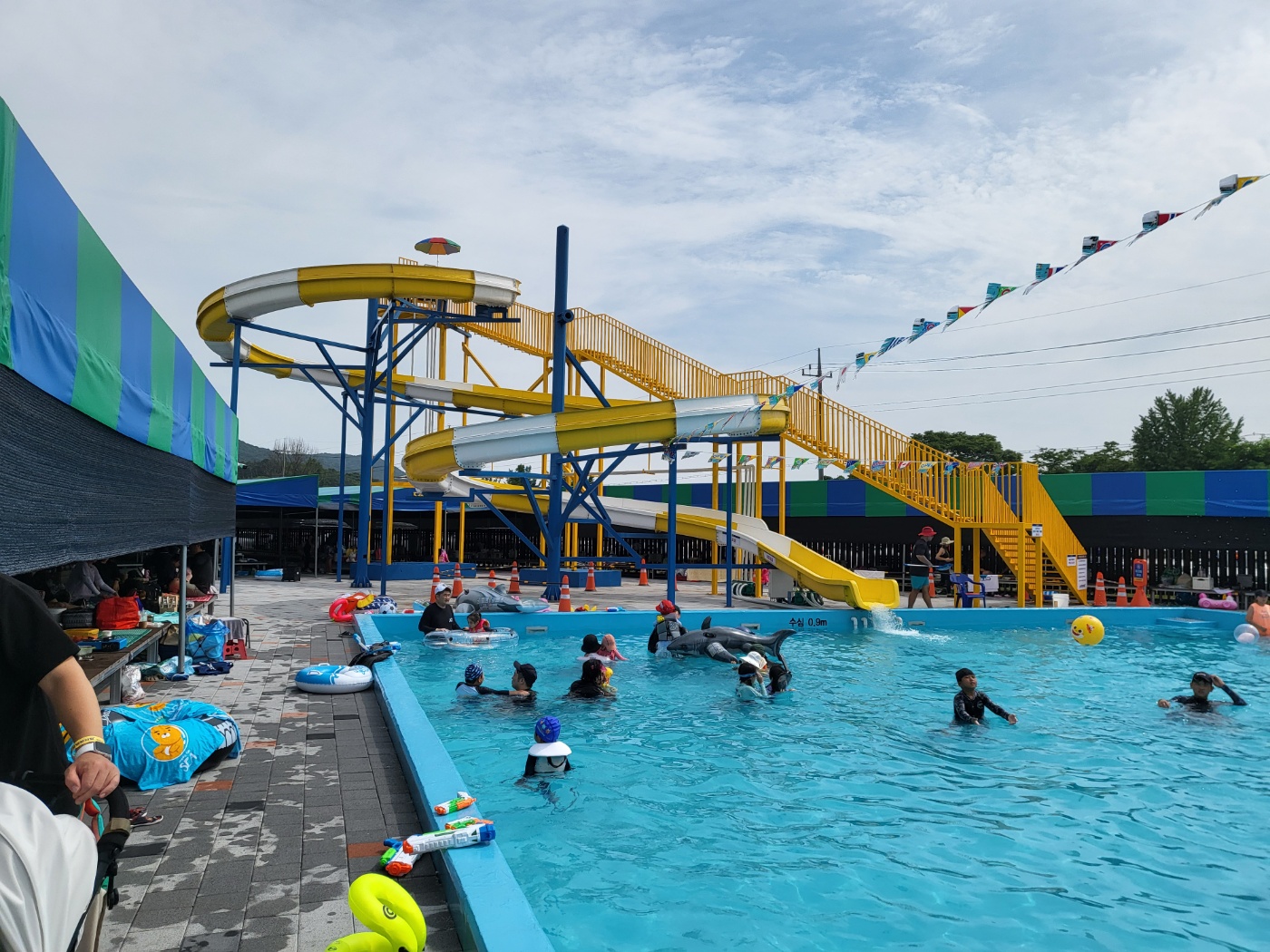 어린이수영장에 작은 놀이터에서나 볼법한 미끄럼틀이 있는데 12세 미만 아이들에게는 충분히 즐거울만한 크기였다. 물로 풍덩 빠지는 기분도 괜찮아보이고 미끄럼틀에 물도 흘러나와서 잘 미끄러진다. 그리고 10분마다 수영장 정비를 해주기 때문에 야외수영장 특유의 나뭇잎이나 벌레들이 떠 있는 경우도 많이 없었다. 아이들이 놀다가 흐름이 끊겨서 조금 아쉬워하기도 하고 점심시간의 경우 1시간이나 쉬기 때문에 좀 아쉬워하는 부분이 있긴 했다.