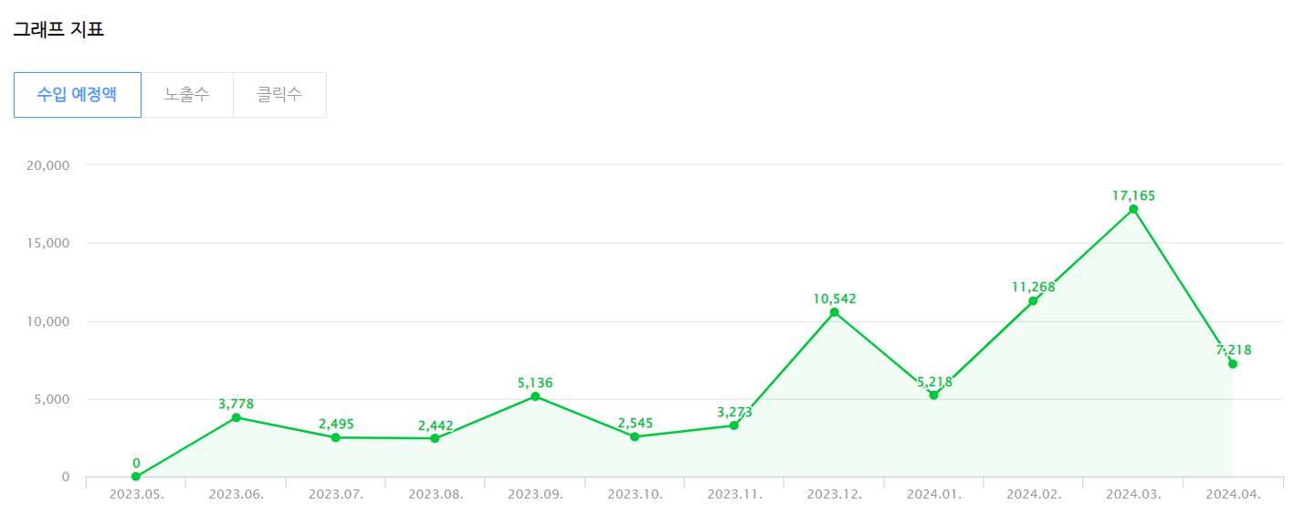 특히나 거의 1주 1포를 하기 시작했던 3월의 경우에는 수익이 초반에 비하면 5배 이상 뛰어서 놀랐다. 아직 4월 초순밖에 되지 않았기 때문에 이번달도 비슷한 수준의 포스팅을 한다면 비슷한 수익이 잡히지 않을까 싶다.