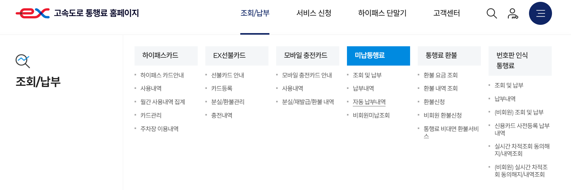 5. 자동납부 신청이후 미납통행료의 자동납부 내역을 확인하고 싶다면 하이패스 홈페이지의 조회/납부->미납통행료->자동납부내역을 클릭하면 조회가 가능하다.