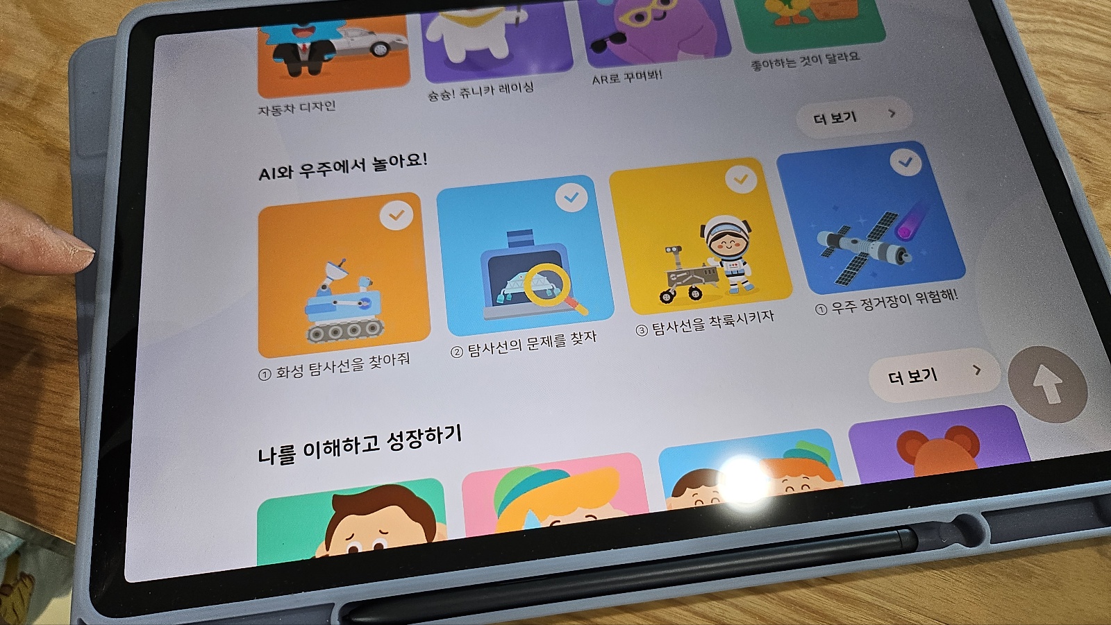 그 다음으로 좋은 부분은 직관적이어서 부모의 도움이 크게 필요 없다는 점이다. 누르거나 수업을 진행하는 동안 아이가 스스로 진행할 수 있을 정도의 난이도와 설명을 하기 때문에 5살짜리 둘째도 혼자 일일미션을 다 해낼 수 있는 정도의 수준이라 잘 안되는 것 한 두개를 제외하곤 큰 도움이 필요없다.