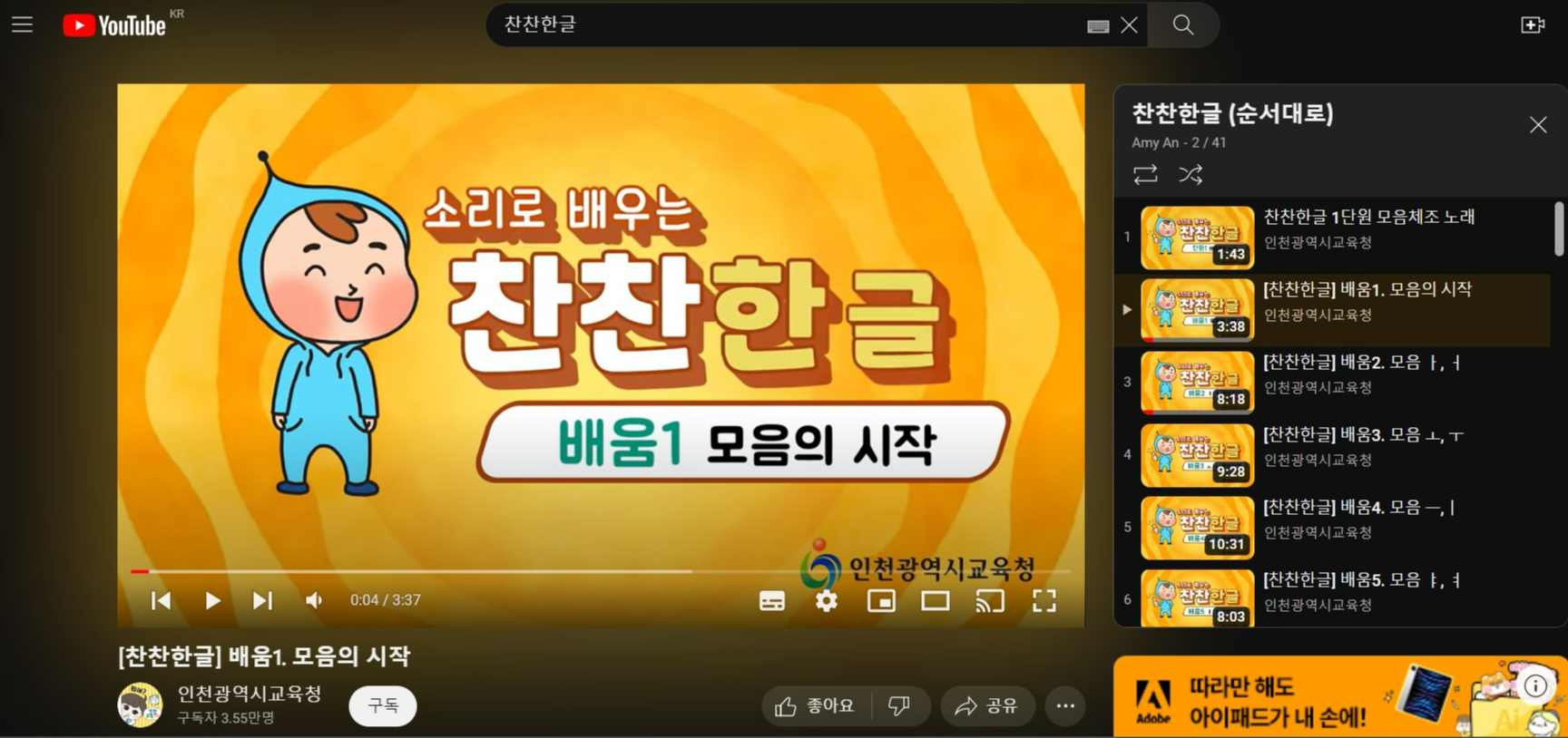 유튜브에 찬찬한글을 검색하면 인천광역시 교육청에서 제작한 애니메이션 교육영상이 나온다. 찬찬한글의 찬찬이라는 캐릭터와 함께 한글을 배우는 것인데 화려한 컨텐츠는 아니지만 아이들의 시선을 끌만큼 귀엽고 재미있다.
