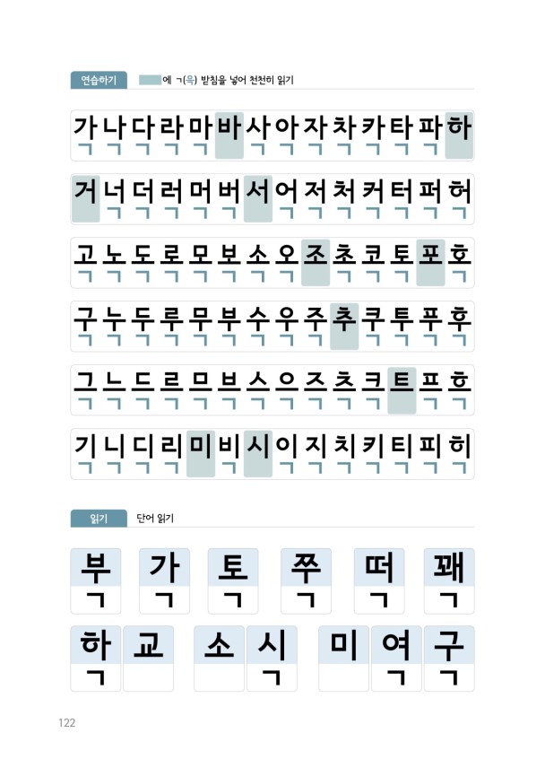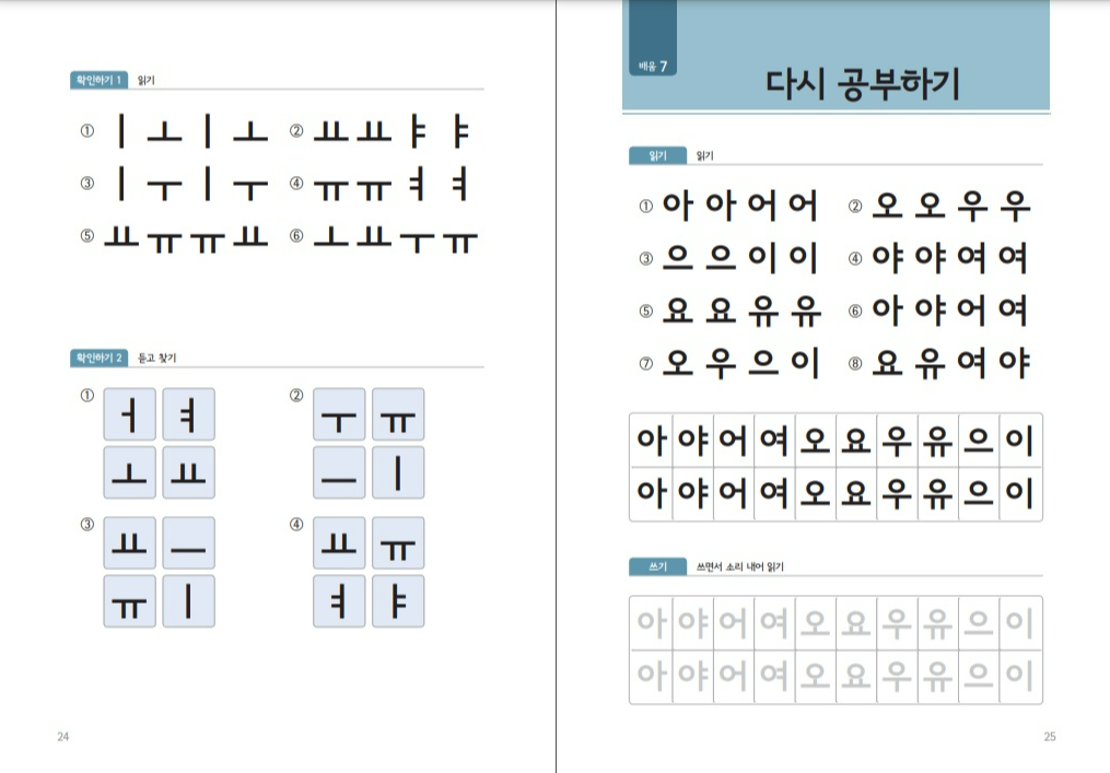 이해하기-비교하기-따라하기-쏘기-확인하기의 순서로 구성되어 원리를 깨치고 비슷한 모음 또는 자음과 비교로 원리를 강화하고 몸으로 글자를 따라하여 체득한 후 글을 직접 써서 기억하게 만들고 마지막으로 제대로 기억하는 지 확인하는 과정을 통해 메타인지측면에서도 아이가 완벽하게 이해하고 다음 단원으로 넘어갈 수 있도록 돕는다.