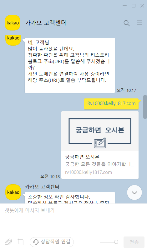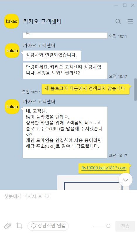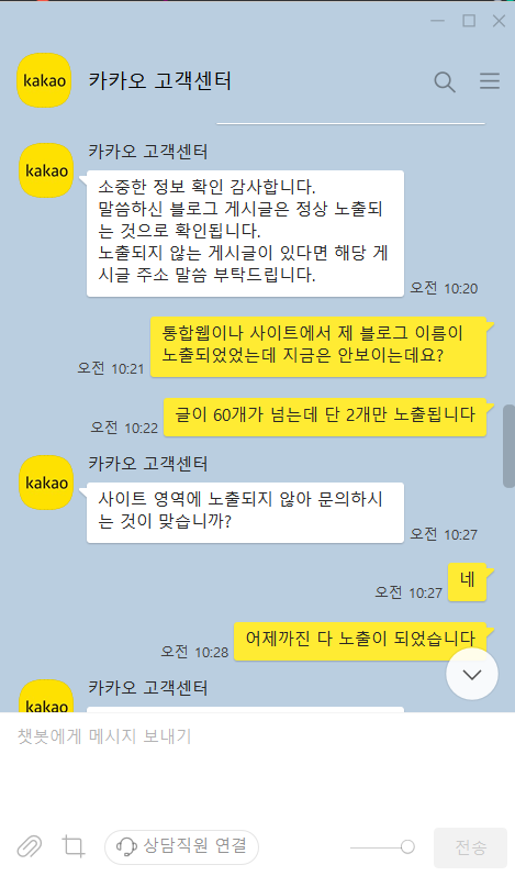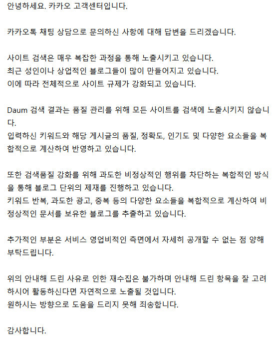 카카오 고객센터의 문의시간인 10시까지 기다려 카카오톡으로 문의하자 내 블로그는 잘 접속이 잘 되는 데 무슨일이냐는 듯이 묻더니 사이트 영역에 노출되지 않아 문의하는 거라고 하자 알아보고 연락을 주겠다며 한참 동안 답이 없었다. 그러고나서 나온 답변에 나는 허탈감을 감출 수 없었다.