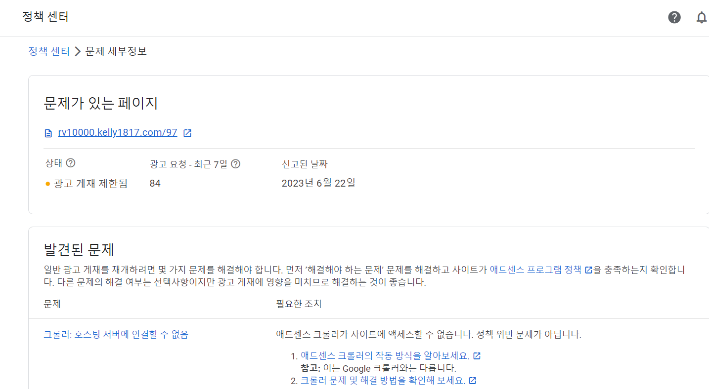 조금 검색해보니 애드센스의 호스팅서버 문제로 인한 크롤러 오류는 정책위반 사항이 아니고 조금 지나면 해결이 되는 문제라고 한다. 문제가 된 글은 내가 바로 직전에 쓴 글인데다 오늘의 유입은 바로 이 글 덕분이었기 때문이다. 수익과 직결될 수 있는 문제라고 생각하니 손을 놓고 있을 수가 없었다. 그래서 성질이 급한 나는 조금이라도 빨리 문제를 해결해보고 싶어서 무한 검색의 길을 시작했다.