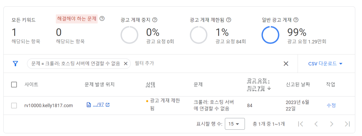 해결해야하는 문제는 0이지만 광고게재가 제한된 것으로 보였다. 고작 1%일 뿐이라는데 이것 때문에 클릭수가 나오지 않는 것만 같은 기분!!